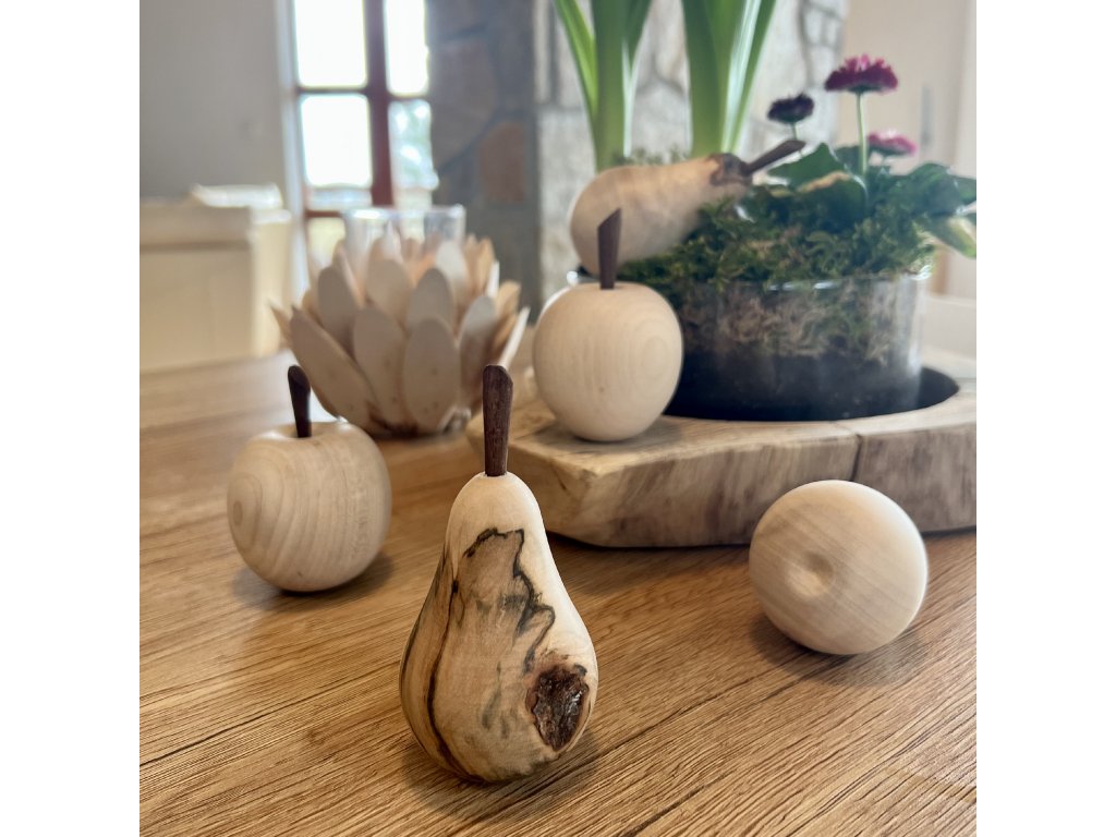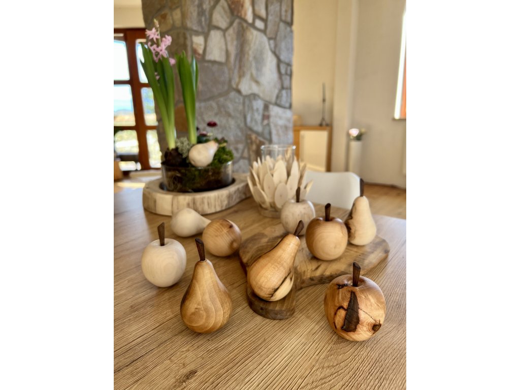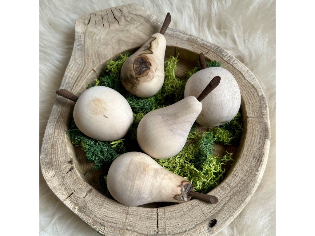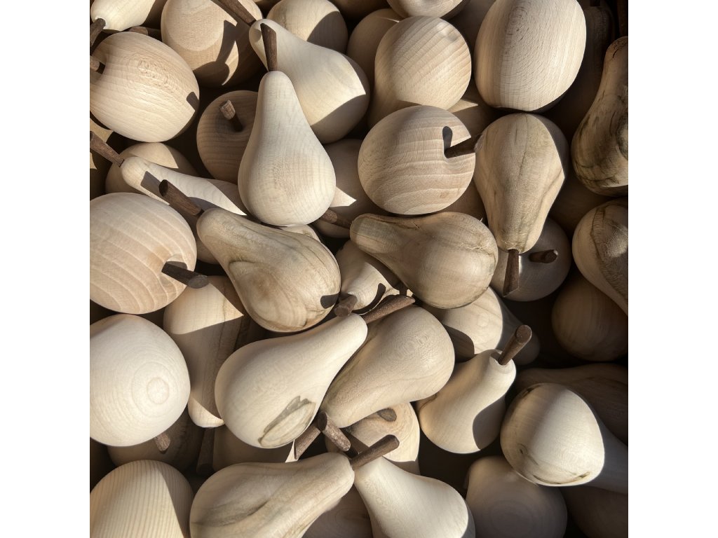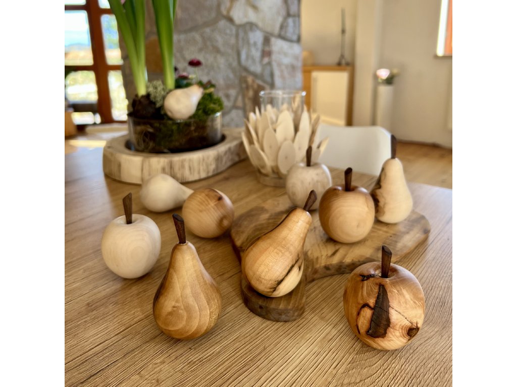 Naše dřevěné hrušky patří mezi nejoblíbenější přírodní dekorace do interiéru i exteriéru. Každá hruška je ručně vysoustružená z kvalitního masivního dřeva (, buk, javor, jasan) a má pečlivě zpracovanou hnědou stopku, která jí dodává realistický vzhled.