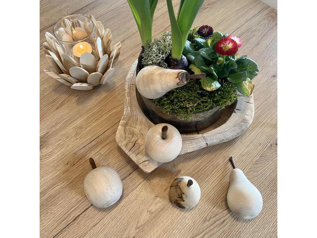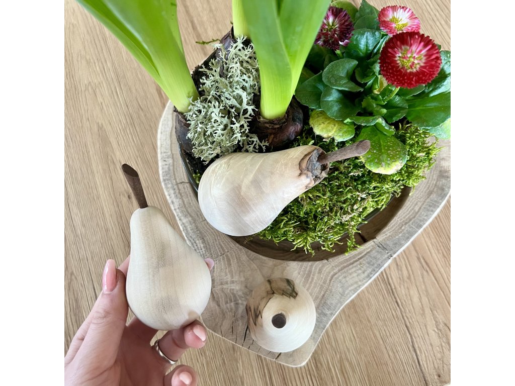 Každý kus je originál – tvar i odstín se mírně liší, což dodává interiéru autentičnost. Dřevěná hruška je skvělým celoročním doplňkem i tipem na dárek.