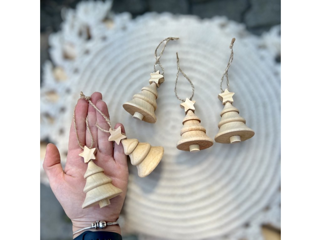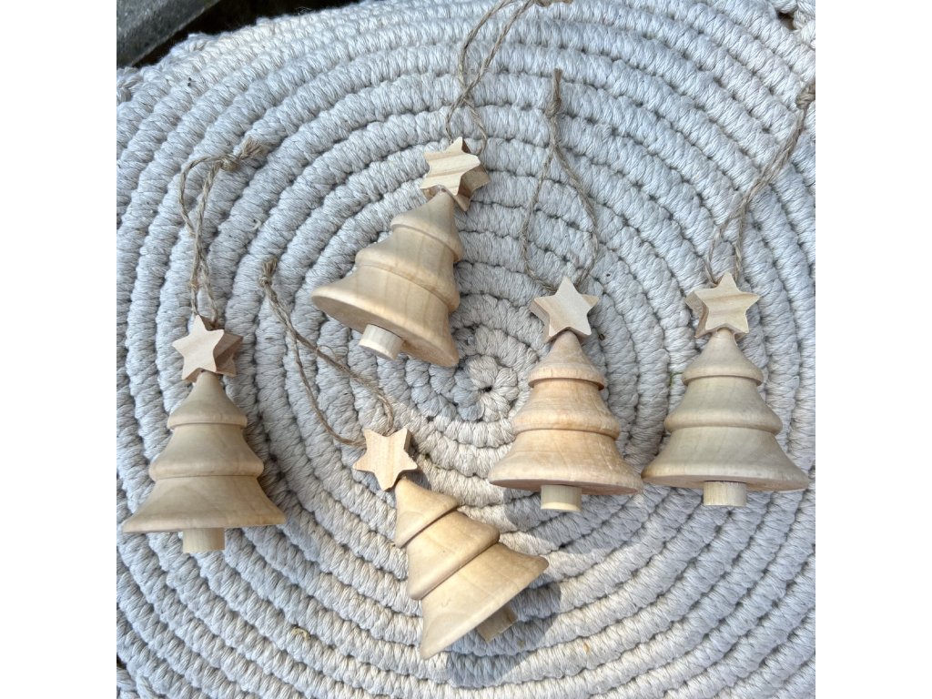 Naprosto kouzelné závěsné stromečky ze světlého, ošetřeného dřeva, které na své špičce zdobí detailně vyřezaná dřevěná hvězdička.