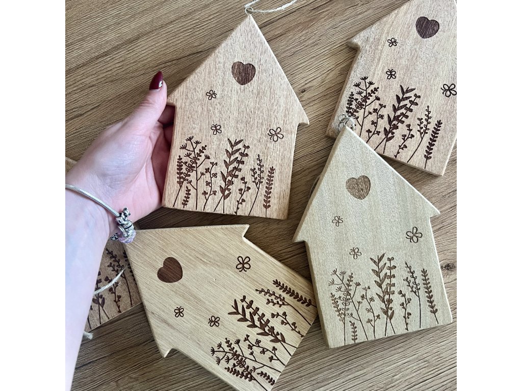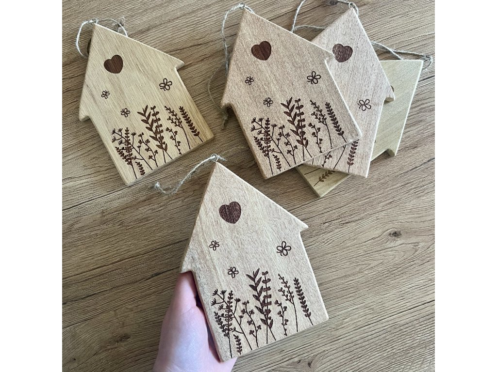 Domeček je vyroben ze světlého přírodního dřeva o tloušťce 0,5 cm. Přední strana je zdobena detailním gravírováním s motivy lučních květin, větviček a drobných kvítků, zadní strana zůstává čistá – vhodná i pro další tvoření nebo personalizaci.