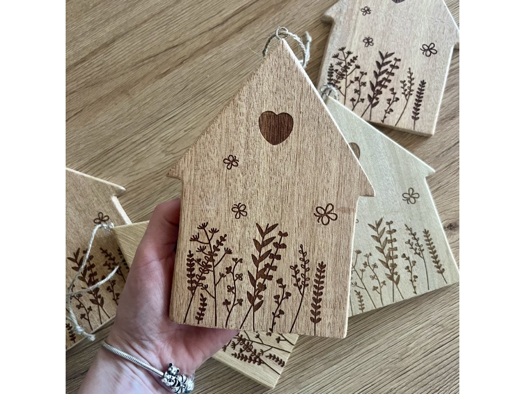 Dřevěný domeček na zavěšení – jarní dekorace s gravírováním