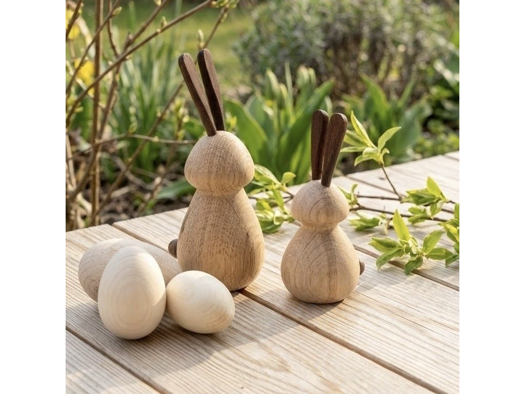 Zajíčci mají tělíčko z dubového dřeva a uši s ocáskem z tmavšího (mořeného), což celému kousku dodá originálnější vzhled.