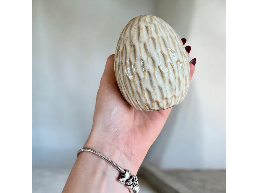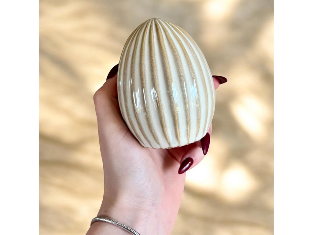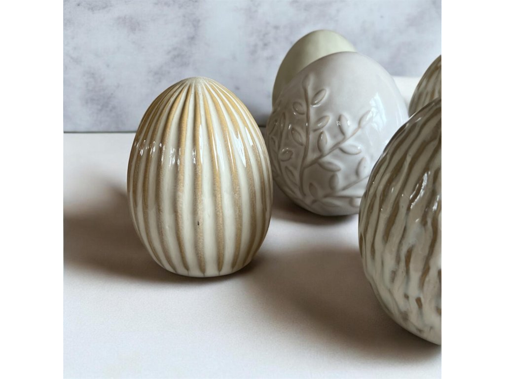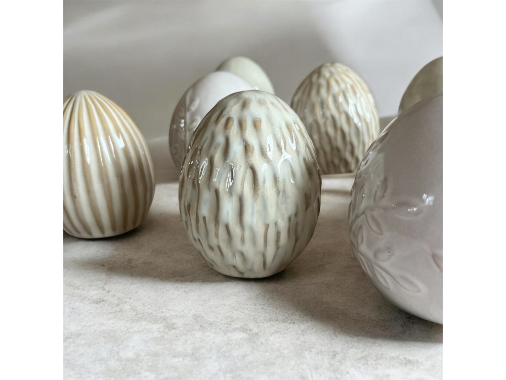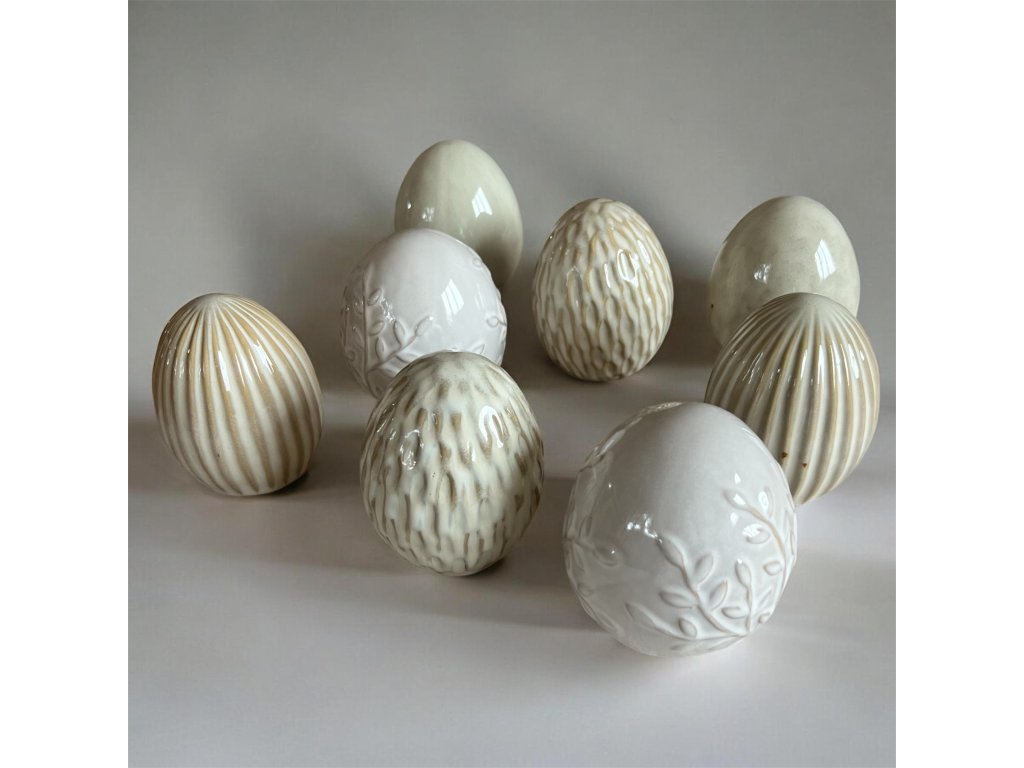 Každé vajíčko je glazované v jemných přírodních tónech, které působí klidně, čistě a elegantně. Vhodné jako jarní dekorace, velikonoční aranžmá nebo celoroční přírodní doplněk interiéru.