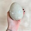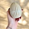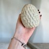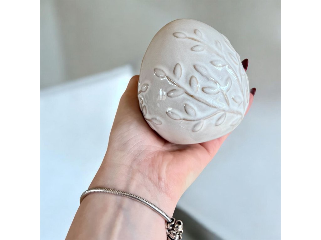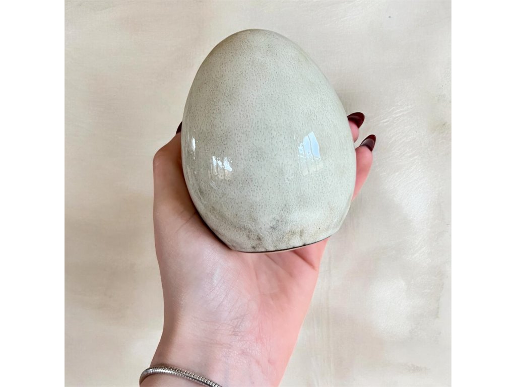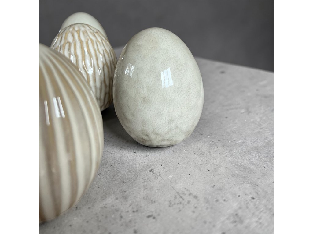 Hladké vajíčko s decentní světle šedobéžovou glazurou s přirozeným mramorováním. Čistý, minimalistický design bez reliéfu.