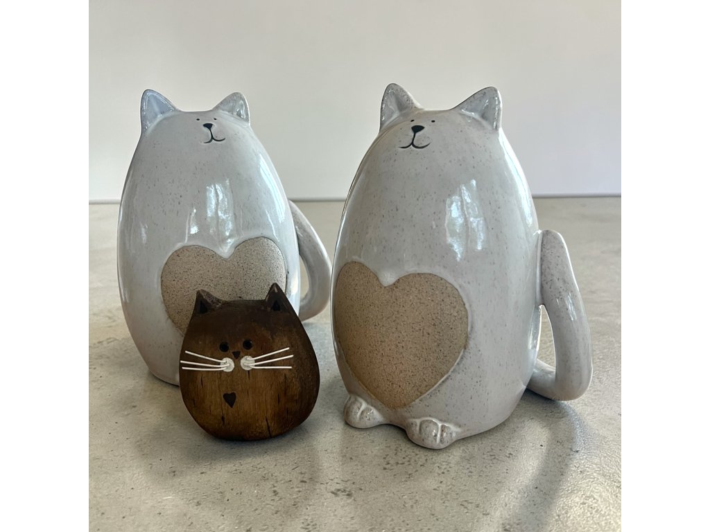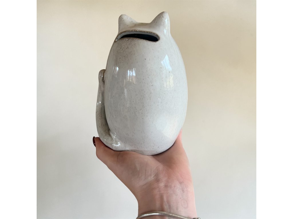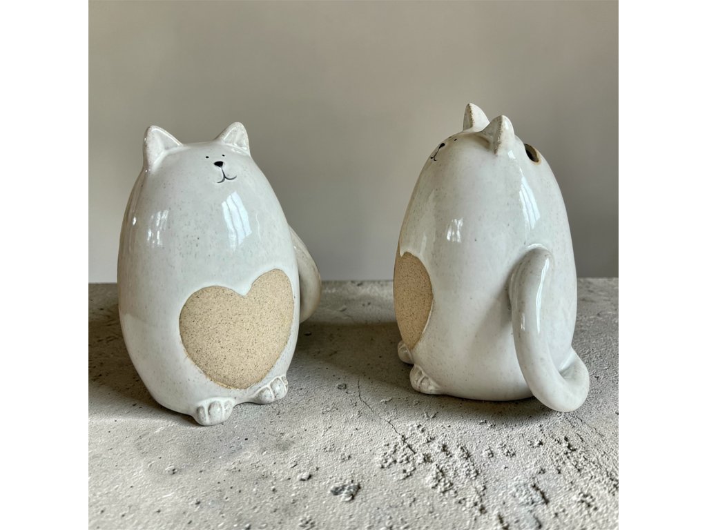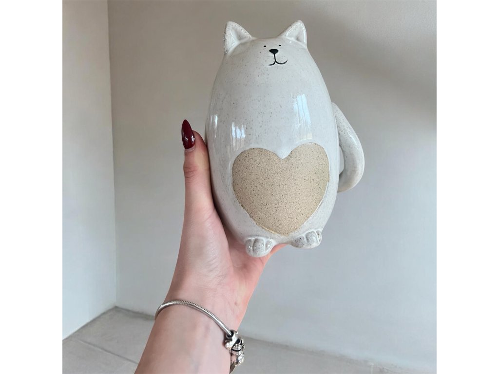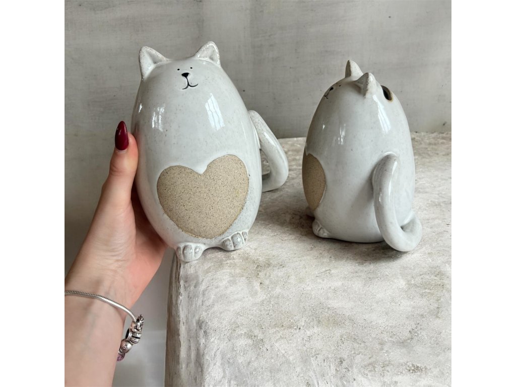 Originální keramická kasička v podobě jemné kočky s výrazným srdcem na bříšku. Kombinuje hladkou světlou glazuru s přírodním, neglazovaným detailem, který vytváří zajímavý kontrast a dodává jí osobitý charakter.
