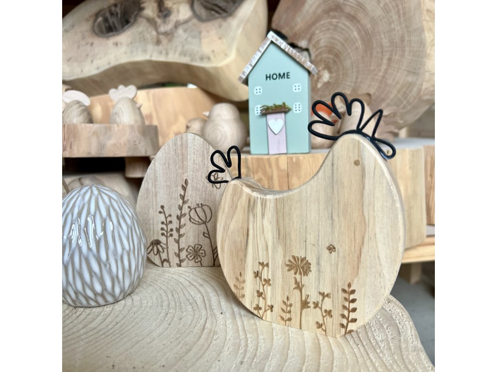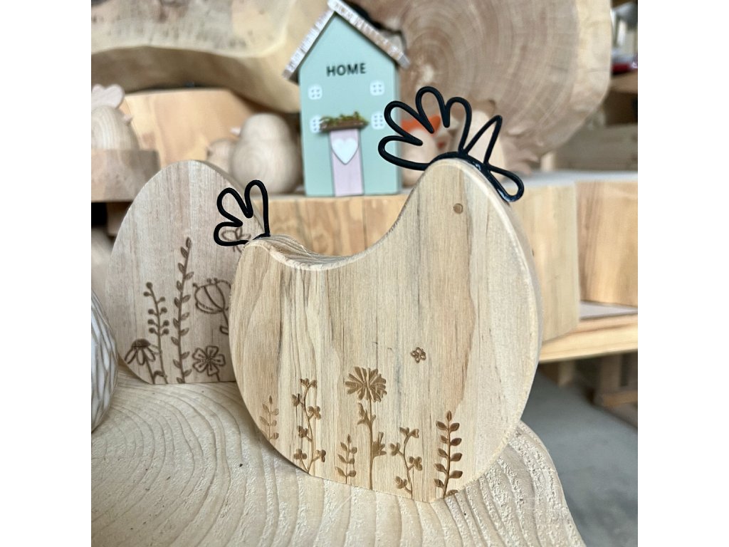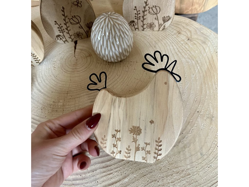 Jemná dřevěná slepička s laserovým gravírováním je precizně zpracovaná jarní dekorace ze dřeva, která zaujme detailním vypalovaným motivem květin a přírodních linií. Dominantním prvkem je právě laserované gravírování do dřeva, které vytváří čistý, elegantní a velmi jemný vizuální efekt.