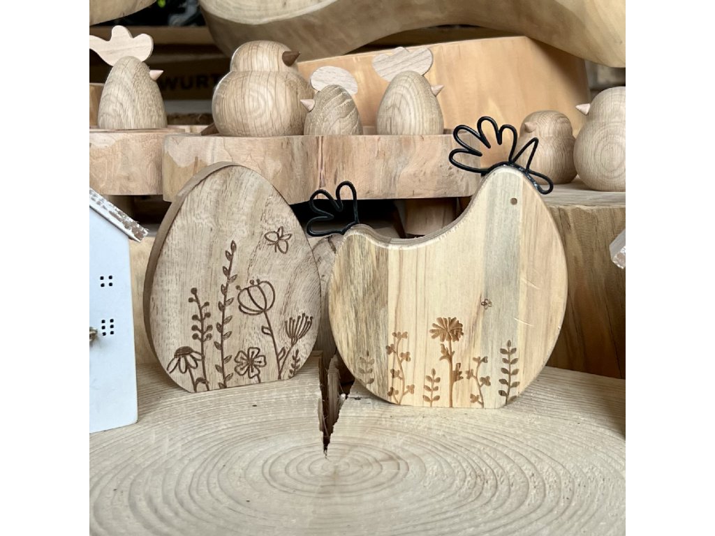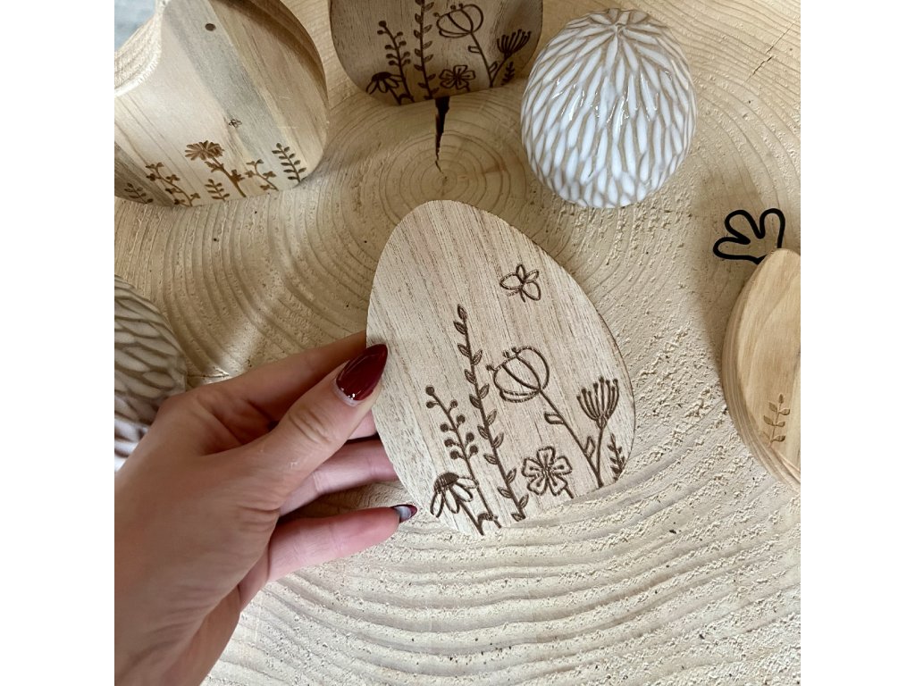 Vajíčko a slepička s laserovým gravírováním je precizně zpracovaná jarní dekorace ze dřeva, která zaujme detailním vypalovaným motivem květin a přírodních linií.