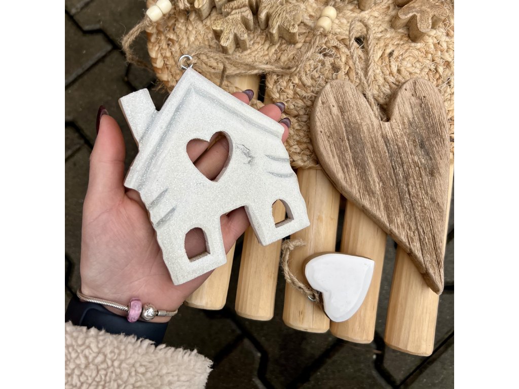 Drobný dřevěný domeček k zavěšení, který přinese do bytu či domu jemnou dekorativní atmosféru. Přední strana je lakovaná do bíla s třpytkami a odlesky, což dodává ozdobě elegantní a slavnostní nádech, zatímco zadní část zůstává v přírodním dřevěném vzhledu — krásný kontrast lesku a přírody.